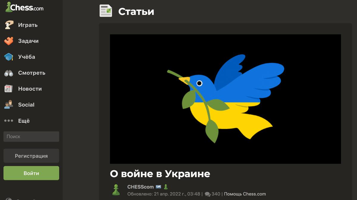 27 февраля, через 3 дня после начала российской «спецоперации», сайт chess.com опубликовал заявление в поддержку Украины. «Геополитику часто сравнивают с шахматами, но агрессия российского правительства, которое игнорирует международное право и суверенитет демократической страны, не имеет ничего общего с нашей любимой игрой», — заявили представители портала.