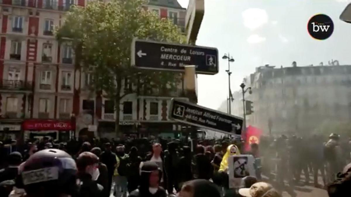 Телеканал France 24 сообщил, что столкновения демонстрантов с полицией вспыхнули в начале первомайского шествия возле площади Республики в Париже. По данным медиакомпании, «анархисты разграбили „Макдональдс“ на площади Леона Блюма и разгромили несколько агентств недвижимости, разбили их окна и подожгли мусорные баки».
