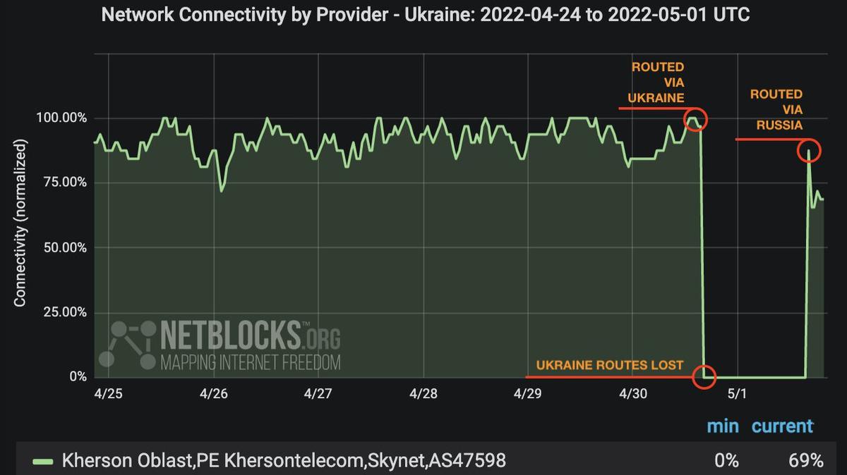 В оккупированном российскими военными Херсоне местный интернет-провайдер SkyNET перешел на сеть российского Ростелекома вместо украинской инфраструктуры. Об этом сообщает проект NetBlocks, мониторящий работу интернет-соединений.