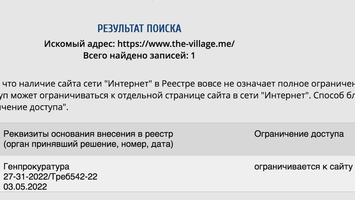 Российский сайт The Village заблокировали в марте. Агентству РИА Новости регулятор пояснил, что в реестр запрещенных сайт The Village попал «за публикацию недостоверной информации по теме операции» в Украине.