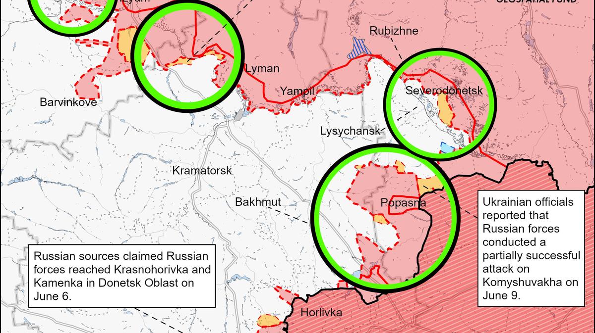 - Идет уже 110-й день войны России против Украины. Как заявили в Институте исследования войны, российские войска последние сутки продолжали наземные штурмы в Северодонецке, но еще не установили полный контроль над городом. Военные РФ, как добавили в ISW, взорвали два моста, соединяющих Северодонецк с Лисичанском через реку Северский Донец, вероятно, пытаясь перерезать украинские наземные пути сообщения, идущие из Бахмута в Лисичанск и Северодонецк. Российские силы также постепенно продвигались к юго-востоку от Изюма и продолжали попытки оттеснить украинские войска от оспариваемых линий фронта к северо-востоку от Харькова, отмечают в ISW.
