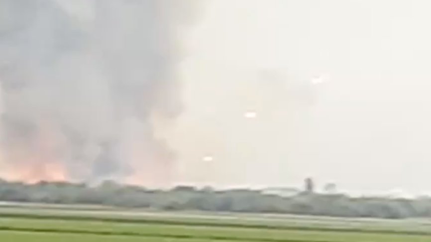 В районе поселка Майское (Джанкойский район) в Крыму произошло «возгорание на территории обвалованной площадки временного хранения боеприпасов одной из воинских частей», заявили в Минобороны России. В соцсетях распространились видеозаписи крупного пожара.