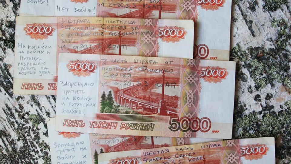 Плотник, писатель и блогер из Петрозаводска Сергей Филенко заплатил штраф за дискредитацию армии (ч.1 ст.20.3.3 КоАП) пятитысячными купюрами, которые он подписал антивоенными лозунгами. Об этом он рассказал в фейсбуке.