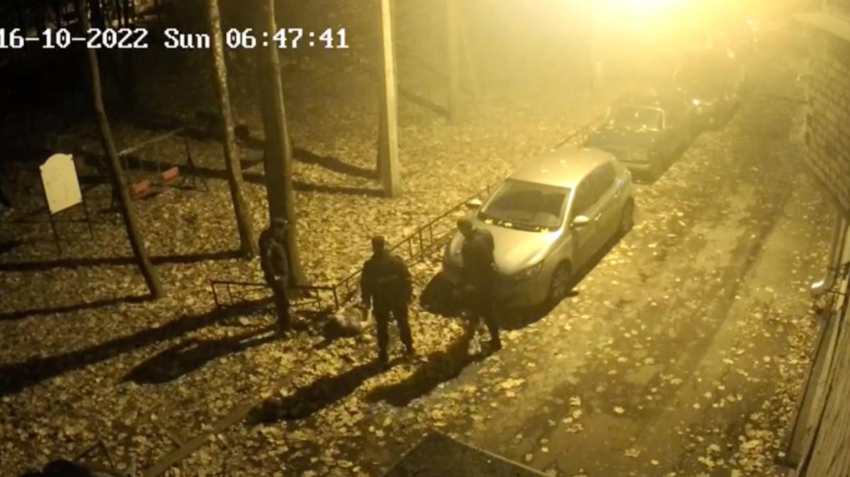 В какой-то момент мужчина падает за один из припаркованных во дворе автомобилей, и на кадрах перестает быть видно, что именно с ним происходит. Спустя несколько секунд он поднимается, и его снова можно различить на видео. Когда к нему подходит один из сотрудников, Шушминцев его отталкивает. Далее троим полицейским удается повалить мужчину на асфальт, но вскоре он снова встает.