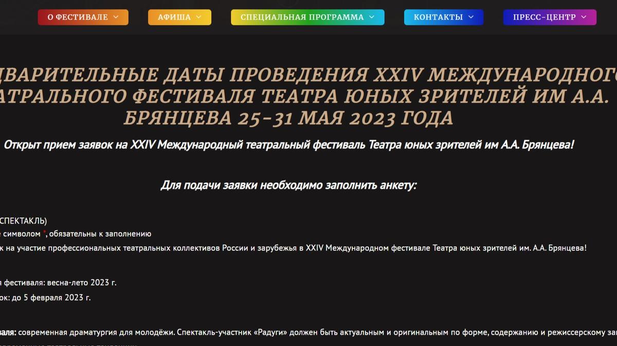Петербургский театральный фестиваль «Радуга» сменил на сайте название на Международный Театральный Фестиваль Театра юных зрителей им. А.А. Брянцева из-за закона о «пропаганде» ЛГБТ. Об этом сообщил журнал «Театр».