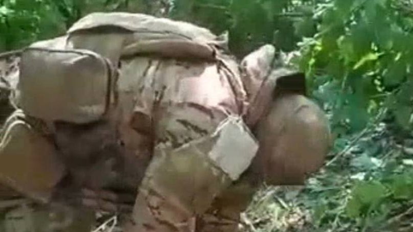 В интернете начало распространяться видео, на котором, как утверждается, люди в военной форме с белыми лентами обезглавливают человека в форме с украинскими знаками отличия.