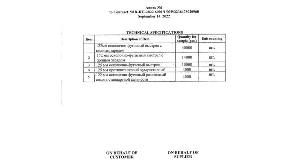 Принимающей стороной в России стал «Рособоронэкспорт». В частности, в рамках контракта от сентября 2022 года компания получила от Ирана более 74 тысячи артиллерийских снарядов за 1,7 млн долларов.