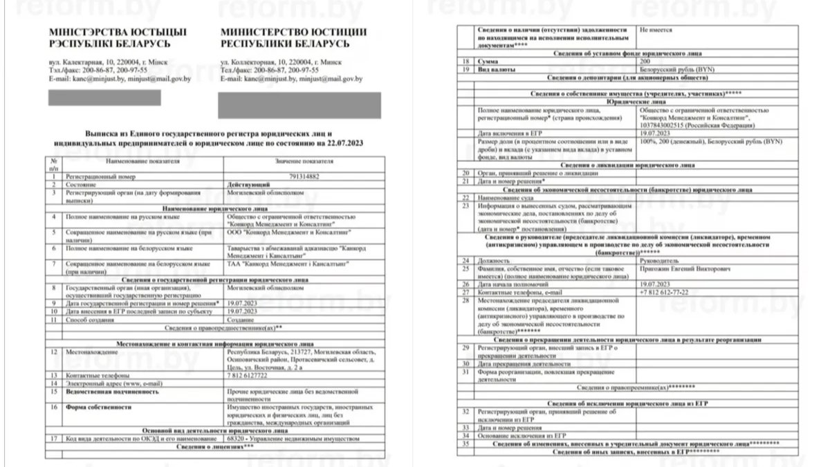 Head and financier of the mercenary Wagner Group Yevgeny Prigozhin has filed documents to register a company, Concord Management and Consulting LLC, in Belarus, Reform.by reports, citing the official register of legal entities.