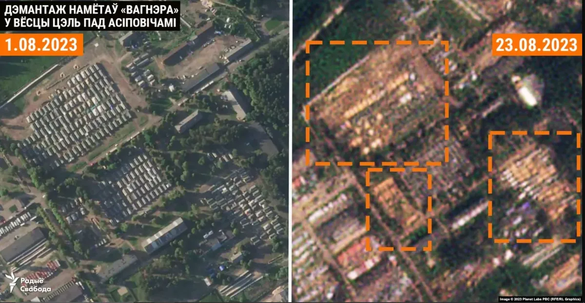 Журналисты показали спутниковый снимок Planet Labs, сделанный 23 августа. По подсчетам «Радио Свобода Беларусь», из лагеря убрали треть всех палаток — около 101 из 273. Предполагается, что лагерь могли покинуть 2020 наемников из примерно 5000. Покинули ли вагнеровцы Беларусь — неизвестно.