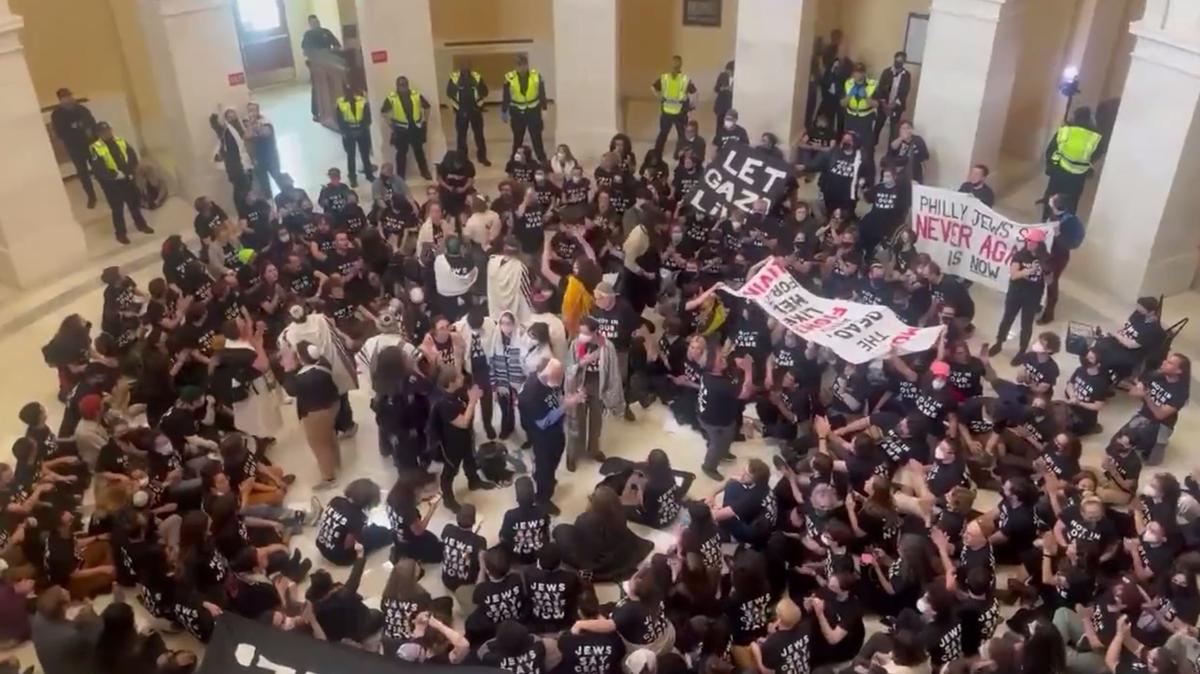 Ворвавшиеся протестующие — это участники движения «Еврейский голос за мир» (Jewish Voice for Peace), придерживающиеся пропалестинской позиции. Они призывают к немедленному прекращению огня в Израиле и Газе.