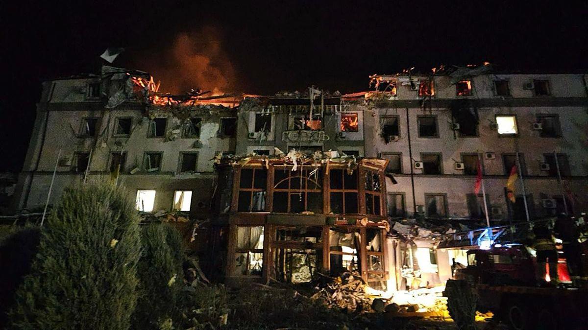 According to Lysak, a fire broke out after the strike on the hotel late on Wednesday night, with 14 apartment blocks, 12 shops, a post office, a cultural centre and multiple cars also damaged in the blast.