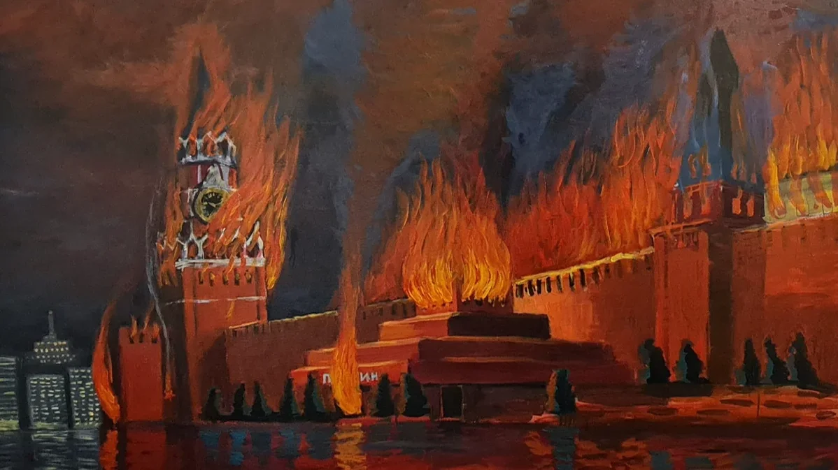 One painting hanging above the bed depicts a Russian warship sinking in the Black Sea. A second shows Ukrainian troops fighting on Russian soil. A third painting, in which the Kremlin is depicted engulfed in flames, is Zelensky’s favourite, according to Shuster, who quotes Zelensky saying “Each one’s about victory. That’s where I live.”