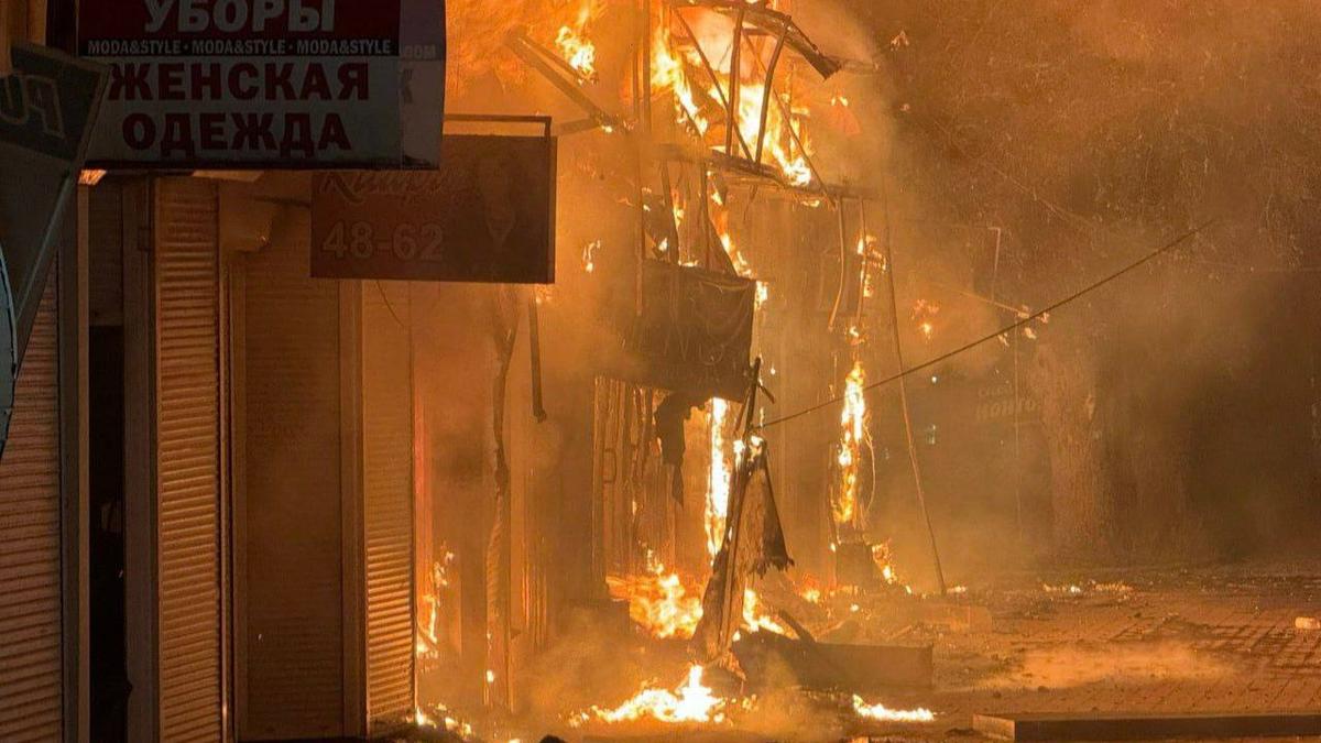 Удар пришелся по торговым павильонам рынка «Сокол», центральному универмагу и банку, добавил чиновник. На месте удара возник пожар, который, судя по фото и видео в соцсетях, к утру 1 июля уже был потушен.