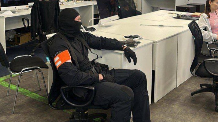 Telegram channel Ranshe Vsekh published footage of the search at the Baza editorial office, showing at least one man in a uniform wearing a balaclava.