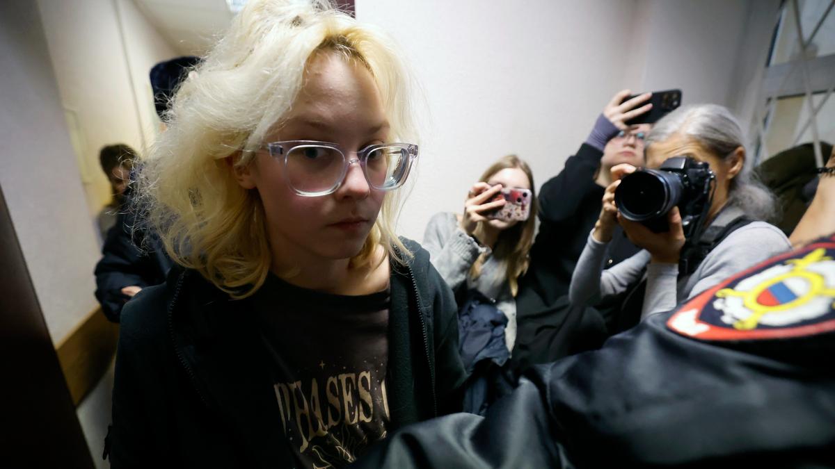 Russian policemen escort street singer Diana Loginova after her court hearing in St.Petersburg, Russia, 28 October 2025. Photo: EPA / ANATOLY MALTSEV
