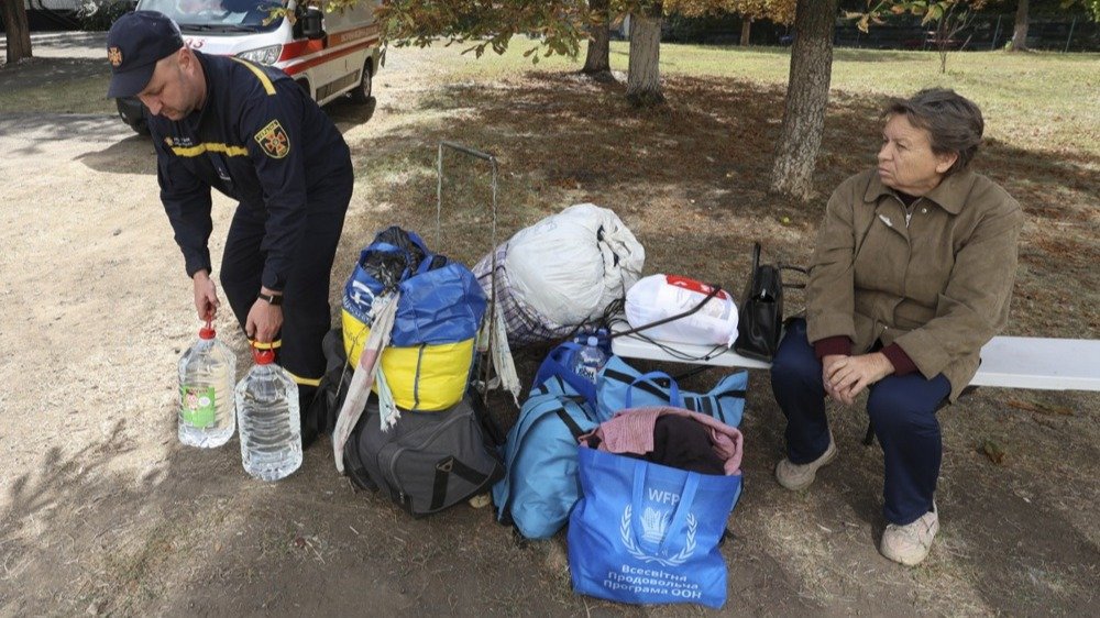 A Ukrainian officer assists internally displaced people at an evacuation centre in the Kharkiv region, Ukraine, 26 September 2025 Photo: EPA / SERGEY KOZLOV