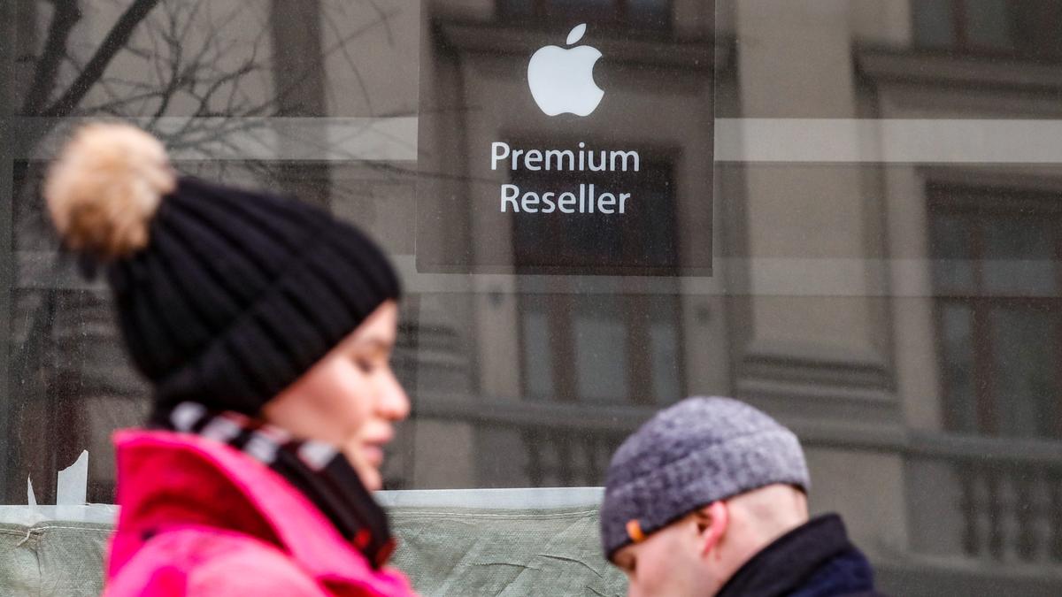 Muscovites pass a former Apple stockist in Moscow, 10 February 2023. Photo: EPA / Yuri Kochetkov
