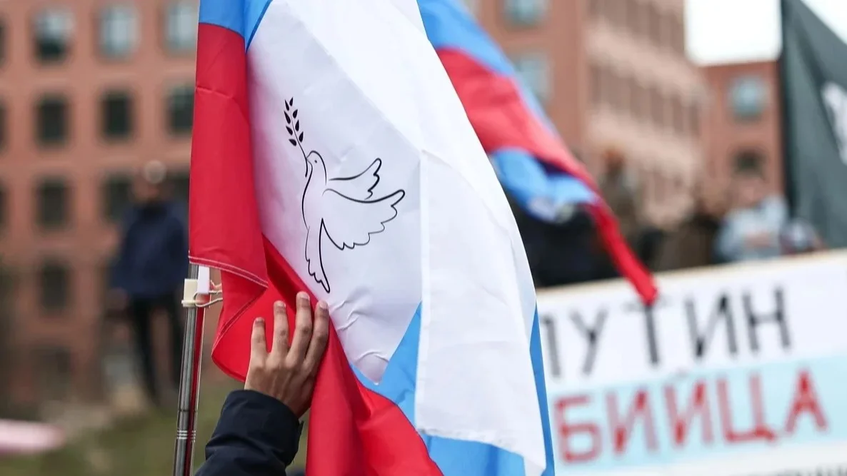 A protestor carries a Russian flag featuring a dove of peace, Berlin, Germany, 1 March 2025. Photo: Hannes P. Albert / dpa / Scanpix / LETA