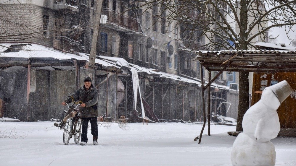 A man pushes his bicycle through the streets of Siversk, on 18 February 2023. Photo: EPA/OLEG PETRASYUK