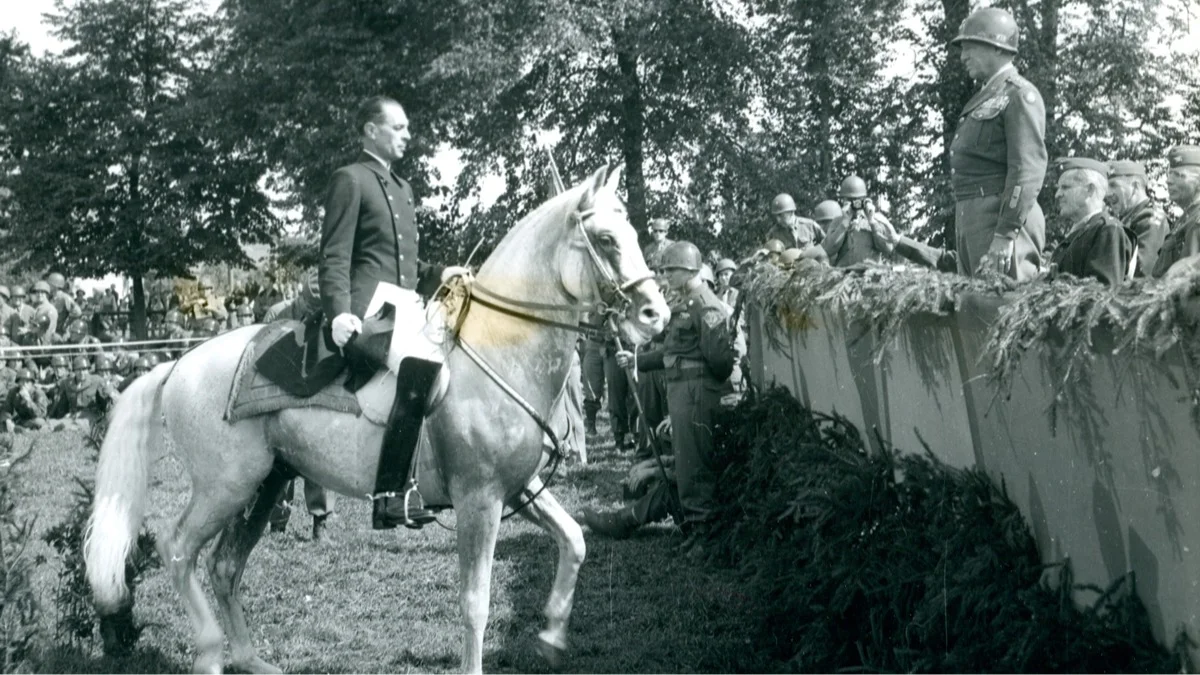 Алоис Подхайски, австрийский офицер и наездник, руководивший Испанской школой верховой езды в Вене с 1939 по 1964 год, проводит демонстрационную езду на липпицианском жеребце перед генералом Джорджем Паттоном и военнослужащими армии США в знак благодарности за помощь американских войск при возобновлении работы школы. Зальцбург, Австрия, 28 августа 1945 года. Фото: akg-images / Scanpix / LETA