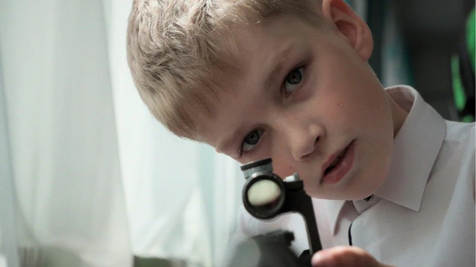 A schoolboy holds a gun in a still from Mr Nobody Against Putin. Photo: Pink Productions