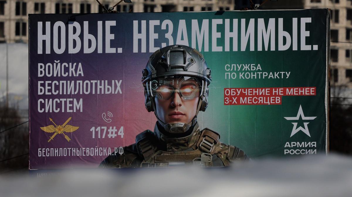 A billboard in Moscow urges Russians to enlist in the newly created Unmanned Systems Forces, 17 February 2026. Photo: EPA / Maxim Shipenkov