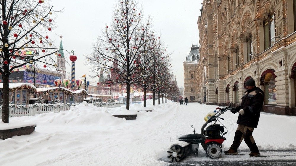 A municipal worker clears the snow-covered Red Square near the Kremlin during a snowy winter day in Moscow, Russia, 25 February 2026. Photo: EPA/MAXIM SHIPENKOV
