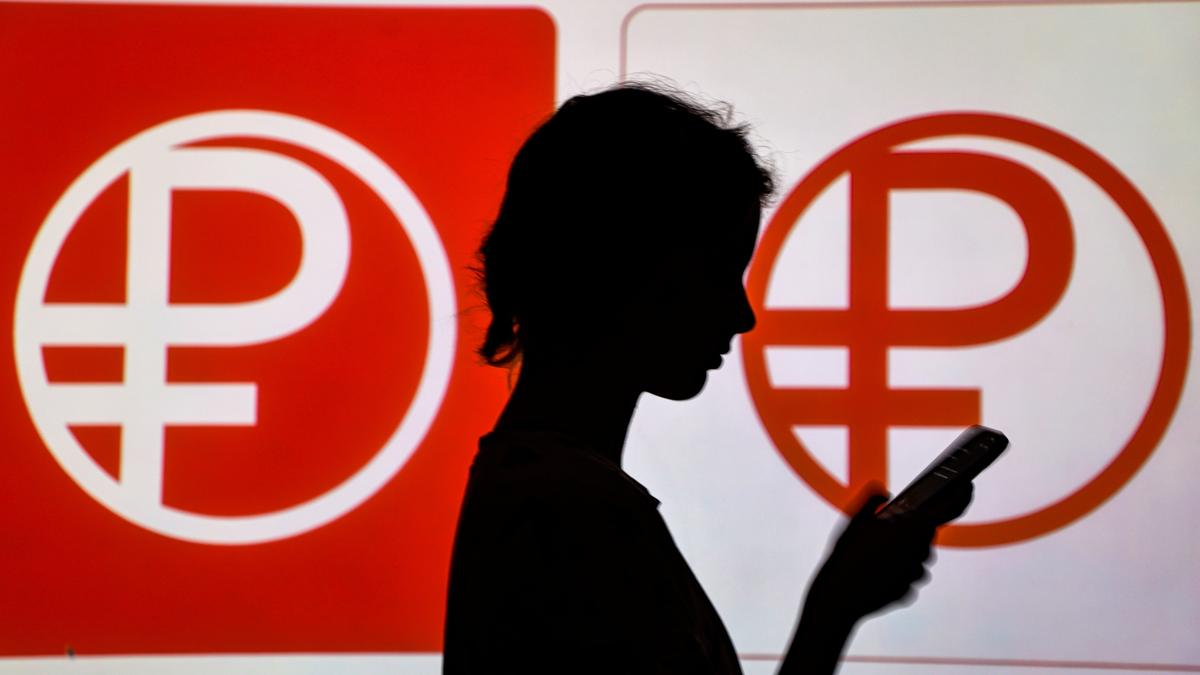 A woman stands in front of digital ruble logos in Moscow, 15 August 2023. Photo: EPA / SERGEI ILNITSKY