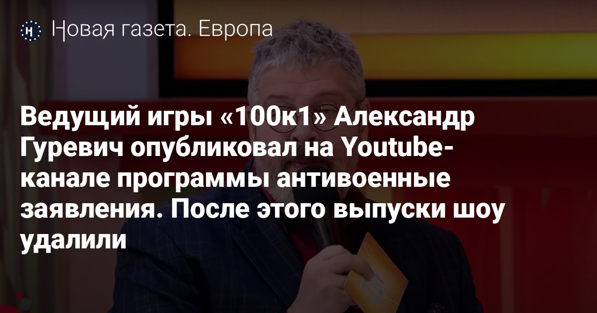 Ведущий игры «Сто к одному» Александр Гуревич опубликовал на Youtube-канале программы антивоенные заявления, заметил журналист Роман Супер. После этого все выпуски шоу удалили.