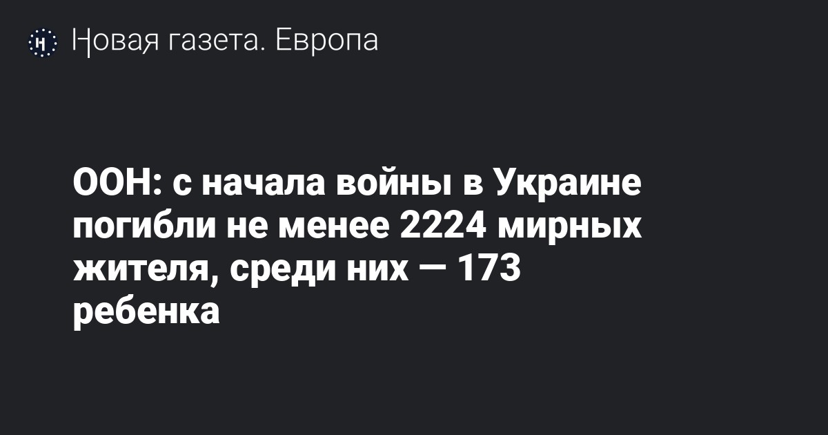 В Украине с 24 февраля — со дня начала вторжения России — по состоянию на 20 апреля погибли 2224 человека, ранены 2897 мирных жителей, сообщает Управление Верховного комиссара ООН по правам человека. Среди погибших — 173 ребенка, добавили в организации.