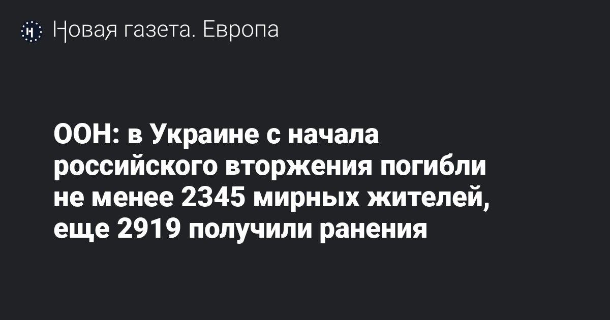 В Украине с начала российского вторжения погибли как минимум 2345 мирных жителей, еще 2919 получили ранения. Об этом сообщает Управление Верховного комиссара ООН по правам человека.