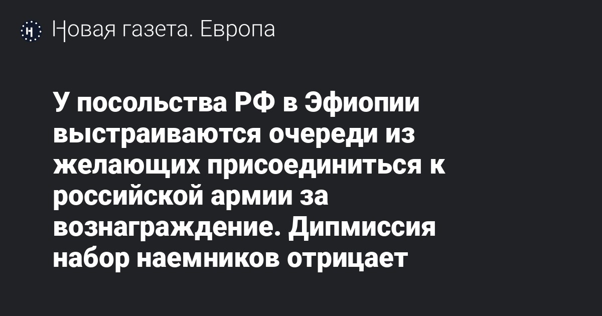 Об очередях у российского посольства в Аддис-Абебе из желающих присоединиться к российской армии два дня назад также сообщило издание Addis Standart. Они появились после слухов в соцсетях о том, что присоединившиеся к армии РФ получат вознаграждение размером 2000 тысячи долларов, объясняют СМИ.