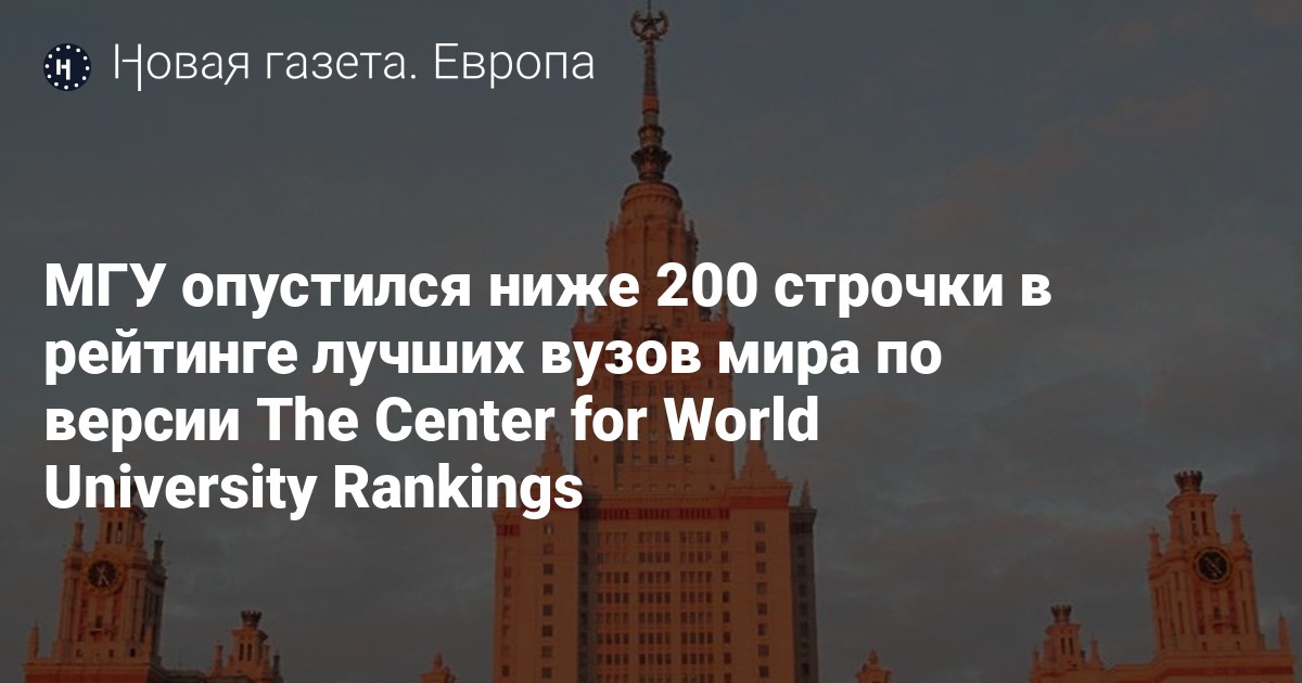 Московский государственный университет имени М.В. Ломоносова вылетел из топ-200 лучших вузов мира по версии The Center for World University Rankings (CWUR). Новый рейтинг опубликован на сайте CWUR.