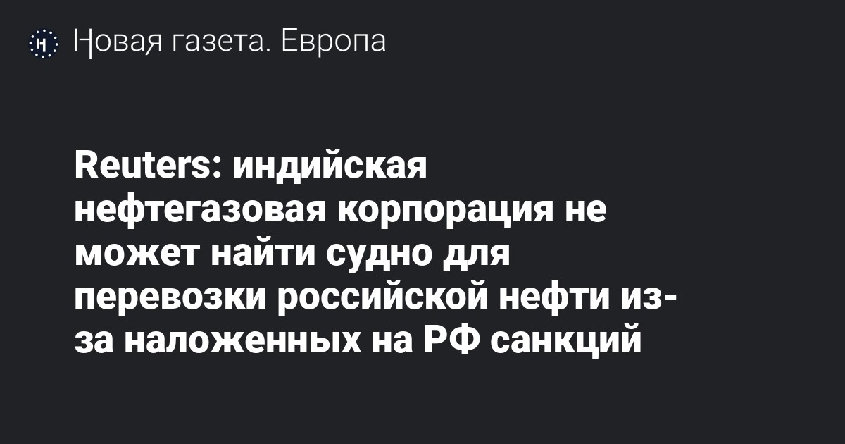 Индийская нефтегазовая корпорация Oil and Natural Gas Corp (ONGC) не может найти судно для транспортировки 700 тысяч баррелей российской нефти с Дальнего Востока России, сообщает Reuters со ссылкой на источники. Сделки с участием одного из крупнейших партнеров Москвы прерываются западными санкциями, отмечают собеседники агентства.