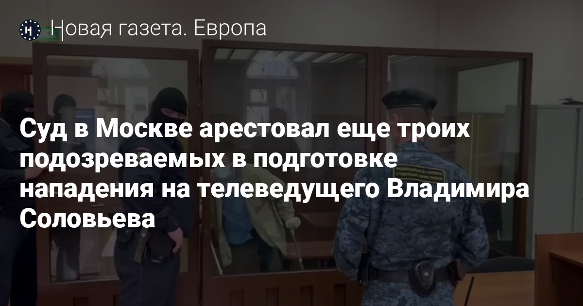 Басманный районный суд Москвы арестовал на два месяца Владимира Степанова, Андрея Пронского и Владимира Белякова, подозреваемых по делу о покушении на российского телеведущего Владимира Соловьева (ч. 3 ст. 144, ч. 1 ст. 30, п. «б», «е», «ж», «з» ч. 2 ст.1 05 УК). Об этом сообщает пресс-служба суда.