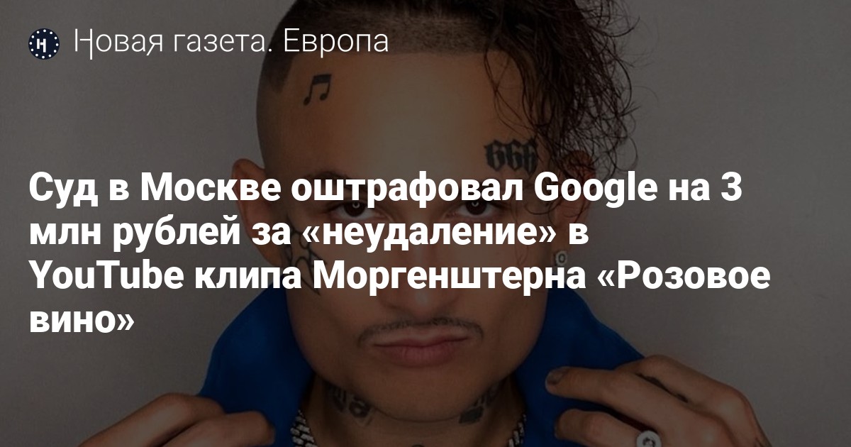 Мировой судья судебного участка Таганского района оштрафовал компанию Google на 3 млн рублей за «неудаление» в YouTube клипа рэпера Алишера Моргенштерна «Розовое вино». Об этом сообщает РИА Новости со ссылкой на пресс-службу суда.
