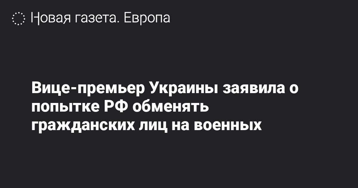 Вице-премьер Украины Ирина Верещук заявила о попытке России обменять украинских гражданских лиц на своих военных, что запрещено Женевской конвенцией. Об этом пишет Русская служба «Би-би-си».