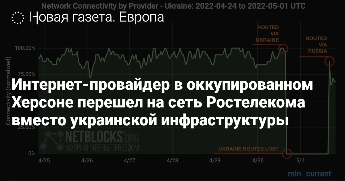 В оккупированном российскими военными Херсоне местный интернет-провайдер SkyNET перешел на сеть российского Ростелекома вместо украинской инфраструктуры. Об этом сообщает проект NetBlocks, мониторящий работу интернет-соединений.