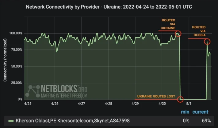 Local Internet provider SkyNET in Russia-occupied Kherson has switched to Russia’s Rostelecom network after mobile communications in the region were cut off, global Internet monitor NetBlocks informs.
