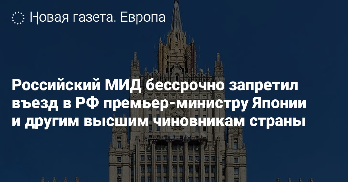 Министерство иностранных дел России бессрочно запретило въезд в РФ премьер-министру Японии Фумио Кисиде и главе МИД страны Есимасе Хаяси, сообщается на сайте российского внешнеполитического ведомства.