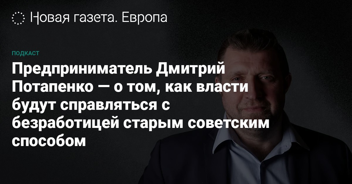 Надежда Юрова, продюсер подкастов «Новой газеты. Европа», поговорила с предпринимателем Дмитрием Потапенко о том, почему пособие по безработице в России получать бессмысленно и за какими должностями граждане будут выстраиваться в очередь. А еще о том, почему национализация не поможет спасти рынок труда и уберечь население от обнищания.