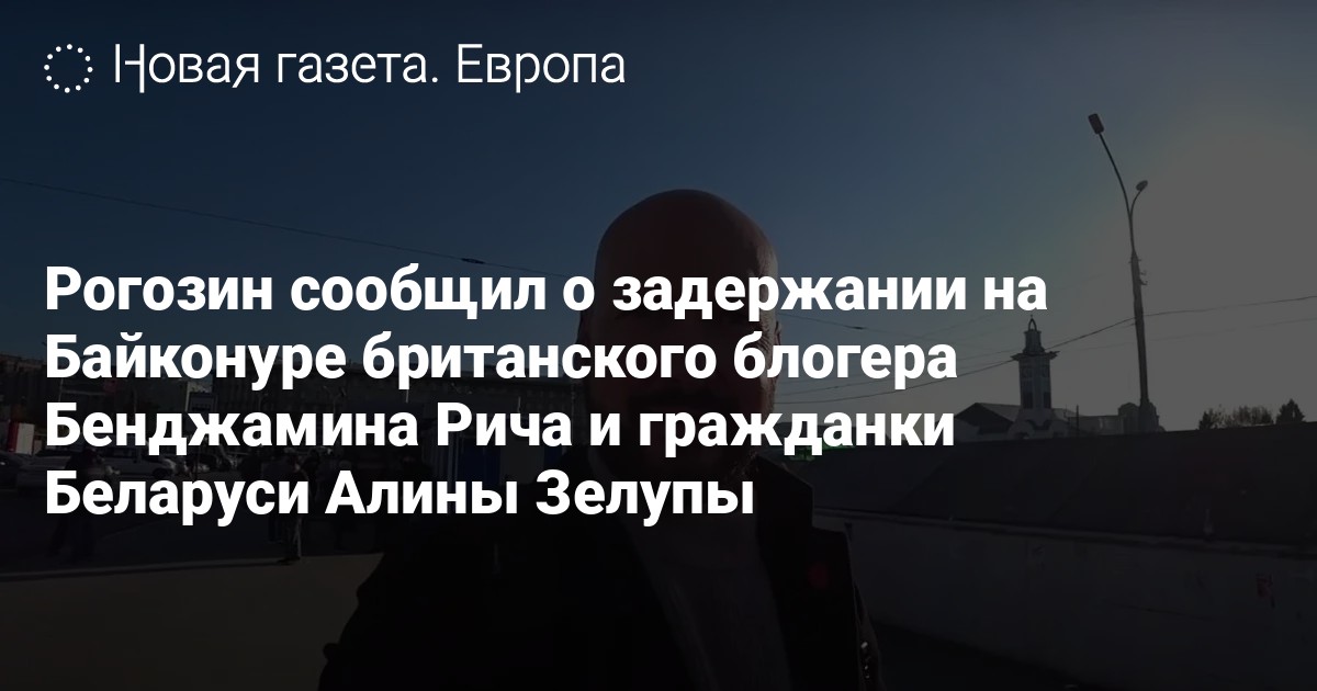 Глава «Роскосмоса» Дмитрий Рогозин сообщил в телеграм-канале о задержании на Байконуре британского блогера Бенджамина Рича и гражданки Беларуси Алины Зелупы.