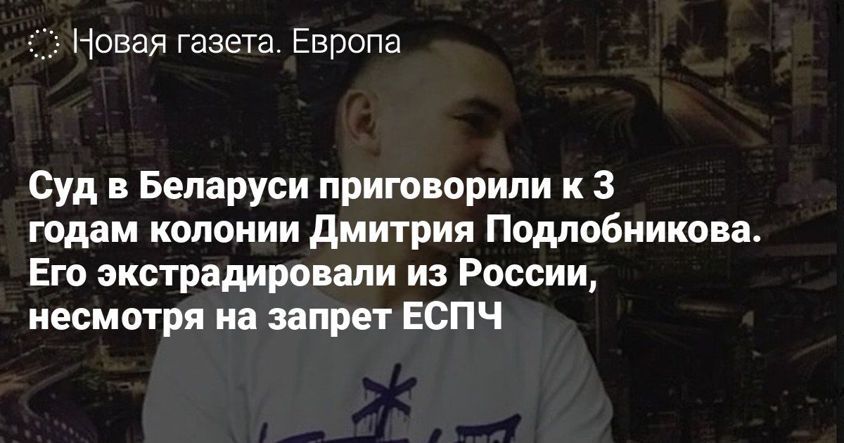 В Беларуси суд приговорил экстрадированного из России Дмитрия Подлобникова к 3 годам колонии строгого режима по обвинению в насилии по отношению к сотруднику милиции (статья 364 УК РБ). Об этом сообщает правозащитный центр «Весна».