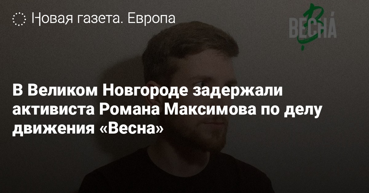 Активиста Романа Максимова задержали в Великом Новгороде и отвезли на допрос в Москву по делу о создании некоммерческой организации, посягающей на личность и права граждан (ст. 239 УК). Об этом сообщило молодежное демократическое движение «Весна».
