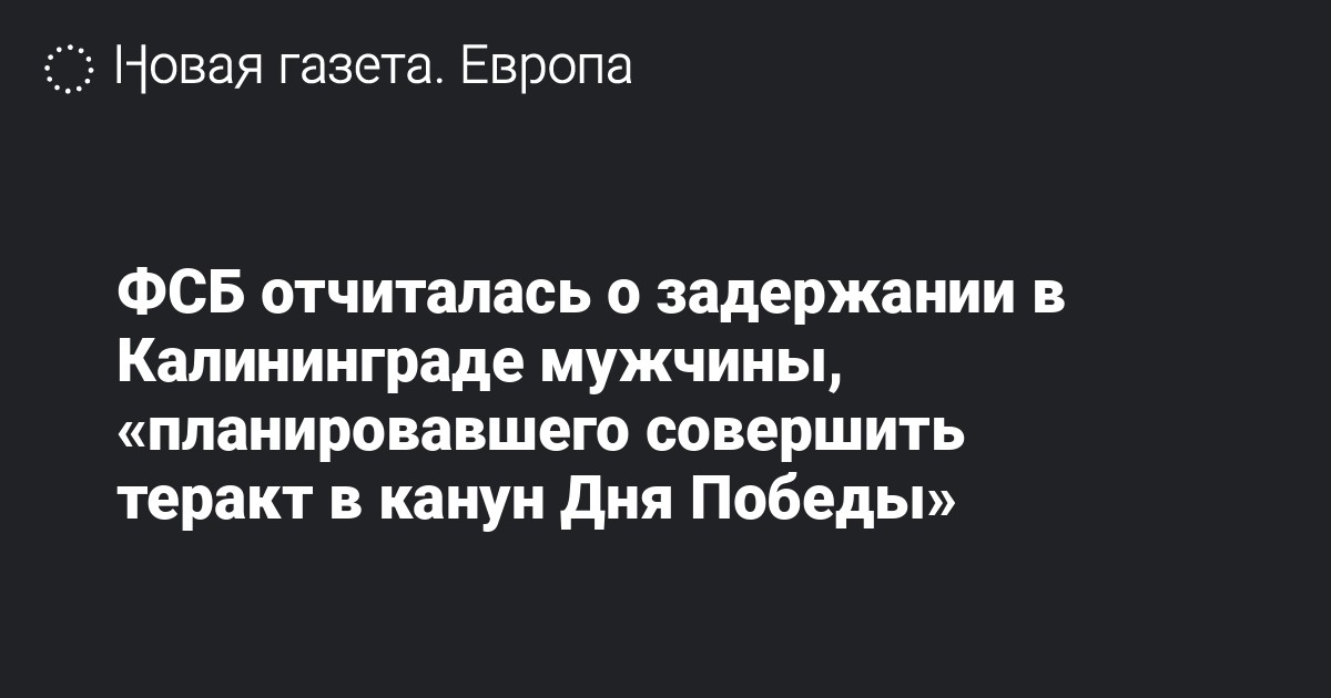 Федеральная служба безопасности (ФСБ) отчиталась о задержании в Калининграде мужчины, «планировавшего совершить теракт в канун Дня Победы». Об этом сообщает «Интерфакс» со ссылкой на Центр общественных связей (ЦОС) ФСБ.