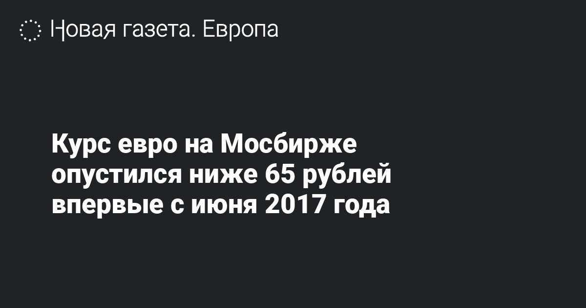 На Мосбирже курс евро упал ниже 65 рублей, это произошло впервые с июня 2017 года, свидетельствуют данные торгов.