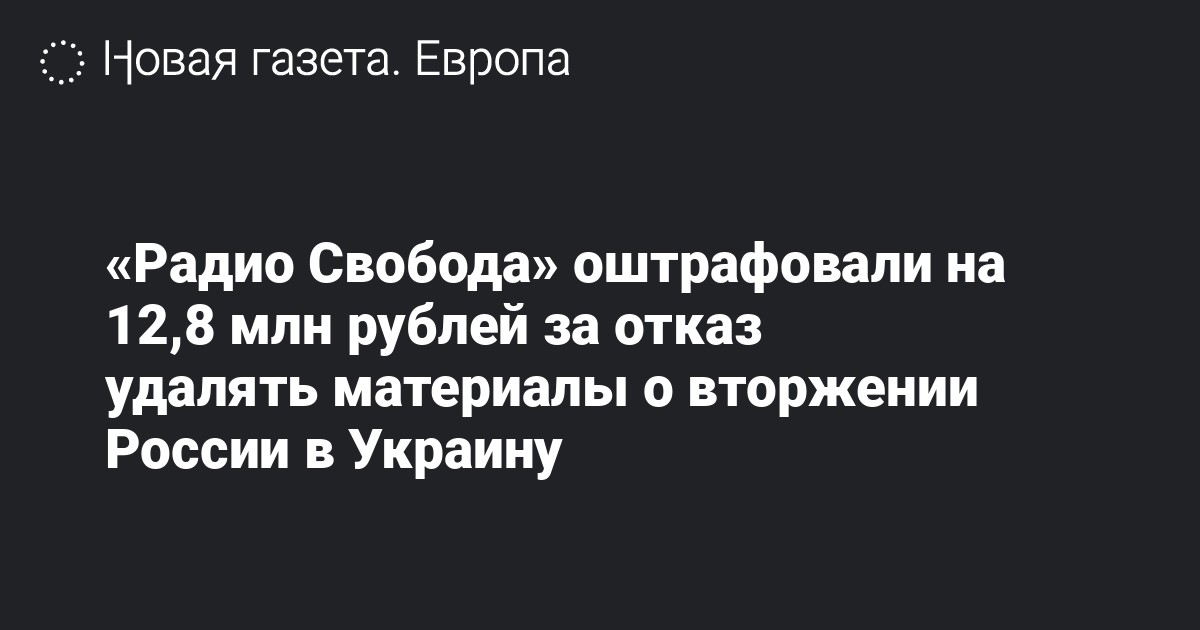 Мировой суд участка №423 Тверского района Москвы оштрафовал «Радио Свобода» на 12,8 млн рублей за отказ удалить материалы о вторжении России в Украину (ч. 2 ст. 13.41 КоАП). Об этом «Интерфаксу» сообщили в пресс-службе Тверского суда.
