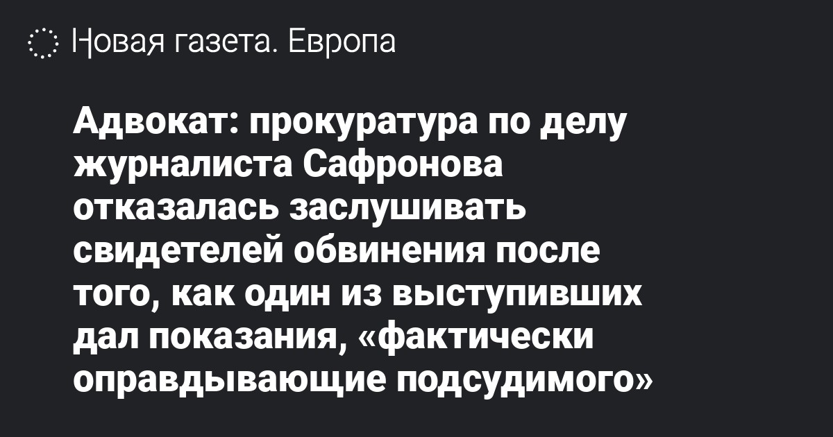 В Лефортовском суде Москвы прокуратура по делу журналиста Ивана Сафронова отказалась заслушивать девятерых свидетелей обвинения. Как утверждает защита журналиста, это произошло после того, как один из шестерых ранее выступивших свидетелей обвинения дал показания, фактически оправдывающие подсудимого. Об этом сообщает «Коммерсант» со ссылкой на адвокатов Сафронова.