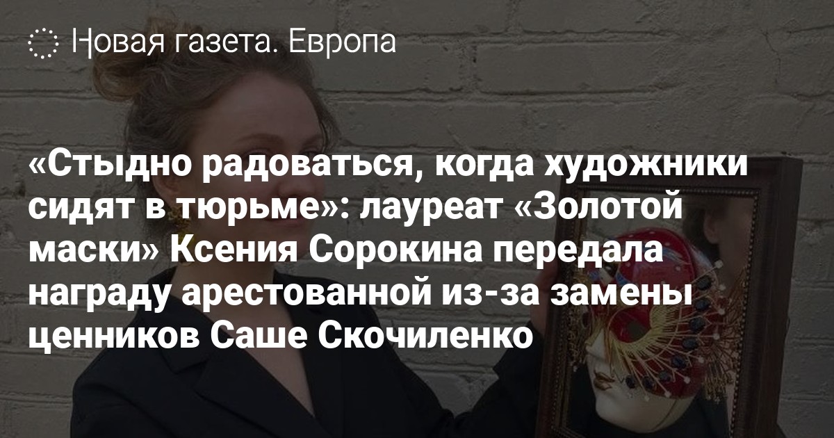 Художница по костюмам Ксения Сорокина, ставшая лауреатом «Золотой маски» в этом году, передала свою награду петербургской художнице Саше Скочиленко, арестованной из-за замены ценников в магазине на антивоенные стикеры. Об этом «Бумаге» рассказала девушка Саши Соня.
