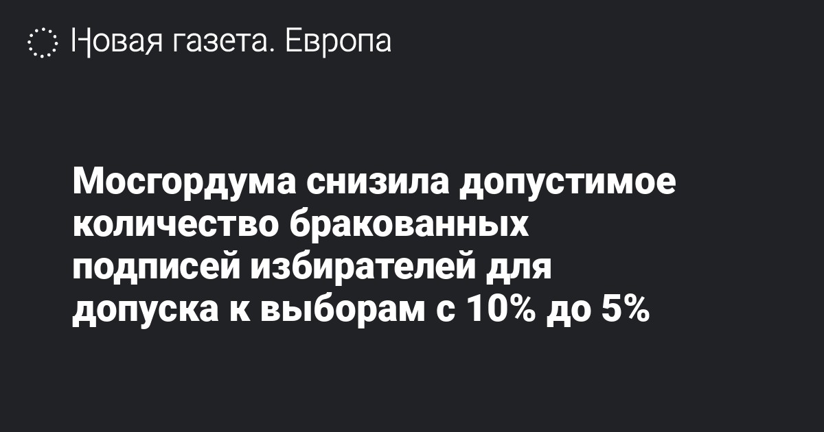 Мосгордума проголосовала за уменьшение допустимого числа бракованных подписей избирателей с 10% до 5% для допуска к выборам. Об этом сообщает «Интерфакс».